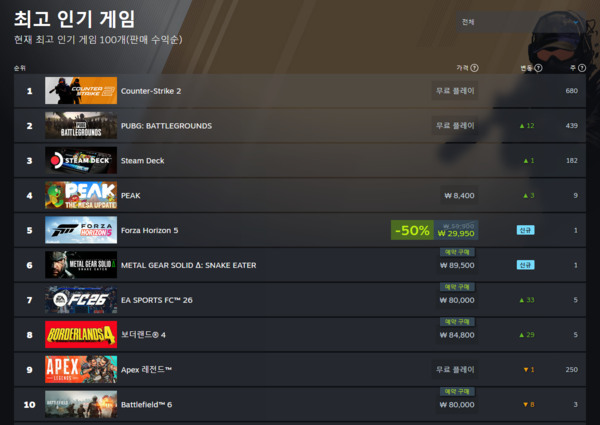 8월 25일 스팀 전세계 최고 인기게임 순위에 따르면, 전체 6위, 7위, 8위, 10위 등 총 4종의 향후 출시 예정 작품이 각각 순위에 이름을 올리고 있다. 오는 28일 출시 예정인 ‘메탈 기어 솔리드 델타: 스네이크 이터’, 9월 26일 ‘EA 스포츠 FC 26’, 9월 12일 ‘보더랜드4’, 10월 11일 ‘배틀필드6’ 순이 그 주역이다.